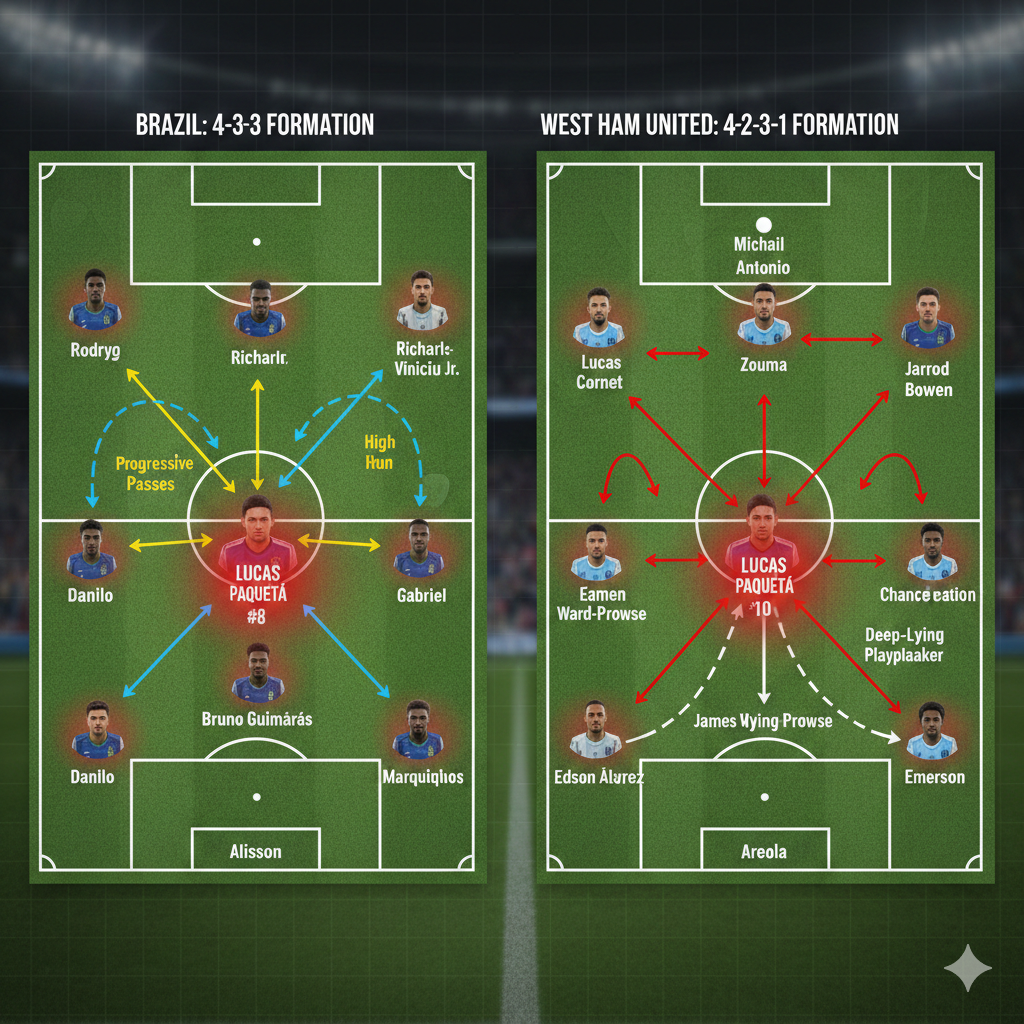 Under the current management, Brazil has moved toward a more fluid 4-3-3 system where Lucas Paqueta operates as the advanced “eight.” This role allows him to: